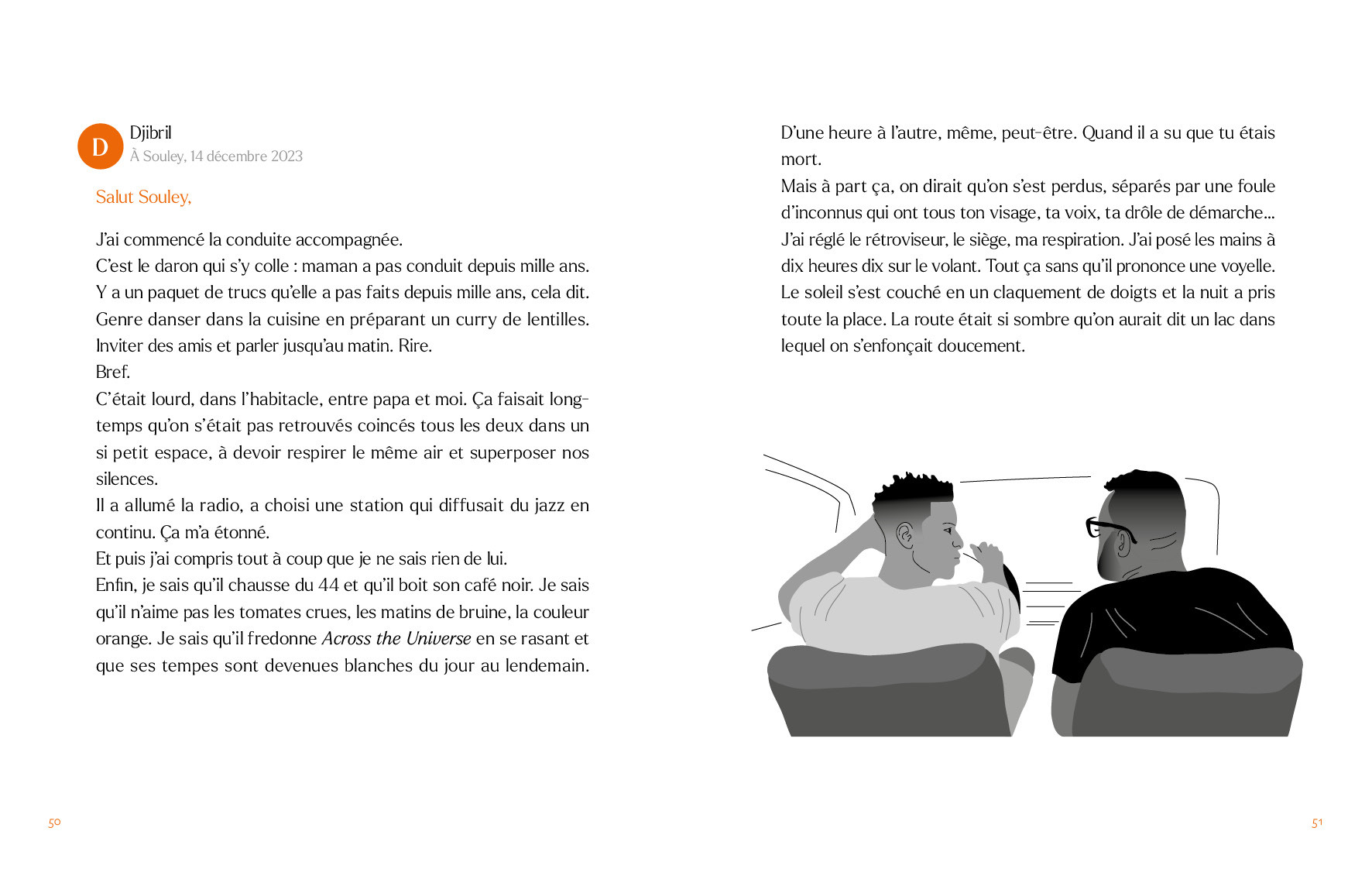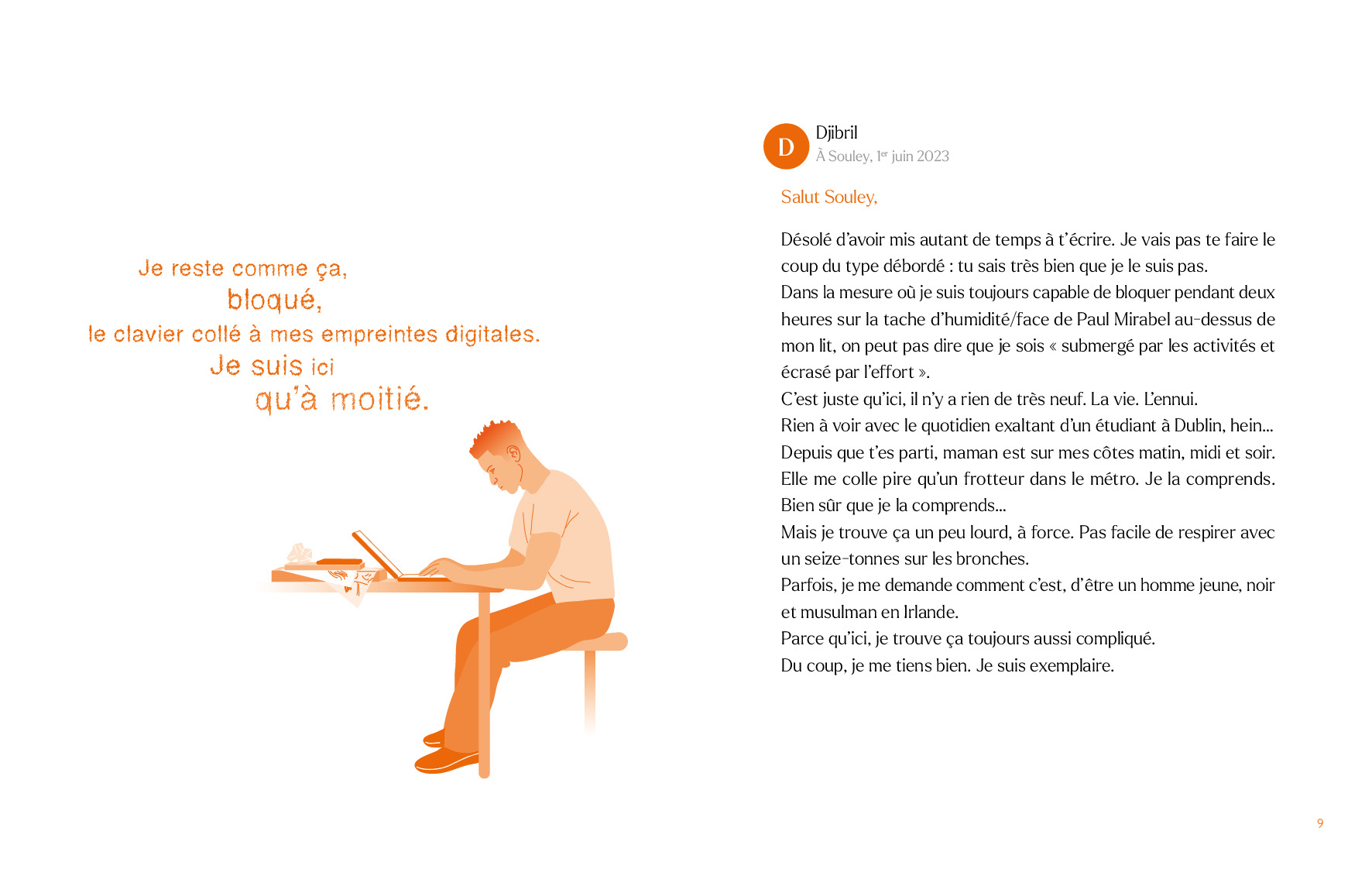 Djibril écrit à son frère Souley. Il lui confie les difficultés d’être un jeune homme noir et le rapport qu’il entretient avec les autres, avec le sexe, avec le monde. Bousculant les clichés, ses ressentis les plus profonds font l’effet d’un coup de poing de réalisme, dans une langue brute qui nous bouleverse. Mais Souley ne lui répondra plus jamais et sans lui, Djibril apprend peu à peu à tout vivre. Chaque page est une explosion, par les mots ou les tableaux.
